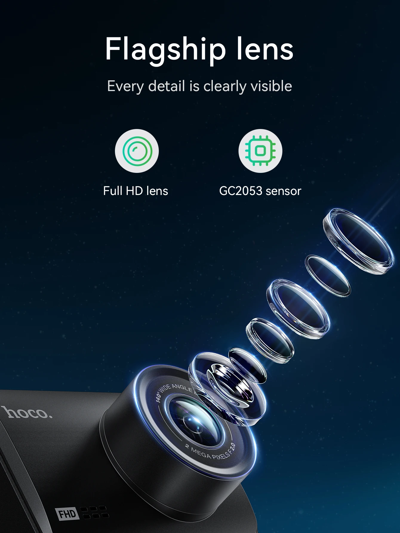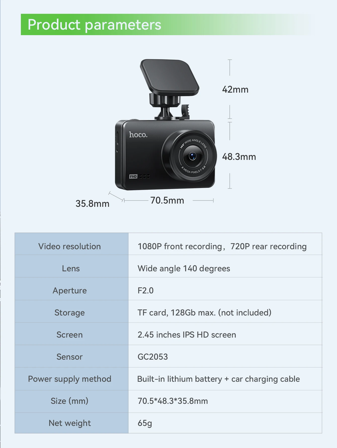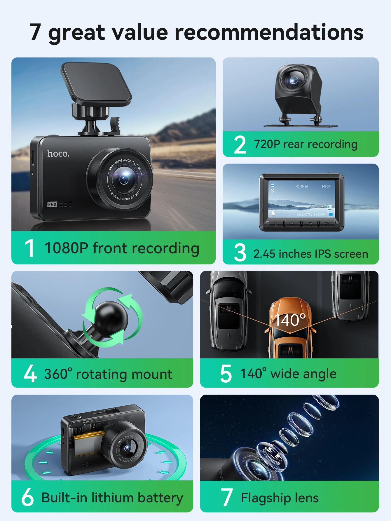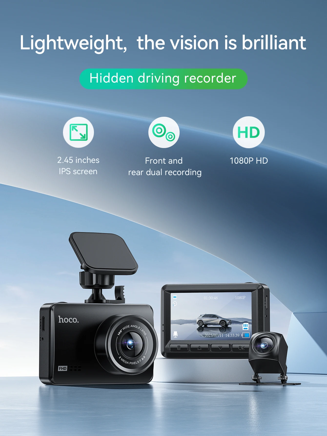 HOCO DV3 Dual 1080P Dash Cam Kit – Front & Rear Hidden Car Camera with 2.45” IPS Display